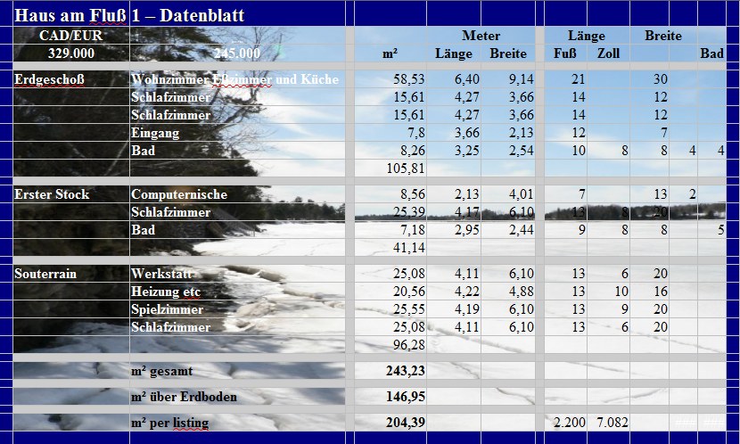 Das Hintergrundbild wurde an der Treppe flußaufwärts aufgenommen. Die Werte in der Spalte "Bad" geben die Anzahl der sanitären Einrichtungen in jedem Bad an. Z.B. im zum Schlafzimmer gehörenden Badezimmer gibt es 2 Waschbecken, eine Toilette, sowie eine Dusche und Badewannenkombination aus Acryl (letztere Einrichtung lieben meine Frau und ich, weil sie absolut pflegeleicht ist, da es anders als bei Fliesen keine Fugen gibt, die unansehnlich werden können) also 5 Einheiten.