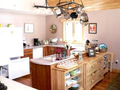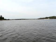 Aber zurück zum Thema zu einem Haus am unteren Lauf des Flusses, das wir ein paar Wochen früher inspiziert hatten. Es liegt herrlich an einer Biegung im Fluß, der hier etwas verengt "nur" ca 300 m breit ist, etwas weiter unten und oben ist er bis zu doppelt so breit und breiter. Das Haus wurde erst 1999 gebaut. Es liegt umgeben von einem Baumbestand in den die Einfahrt und die Gartenfläche hineingeschnitten wurde. Dadurch ist es trotz einer Fläche von "nur" ca 0,7 ha (ca 7.000 m²) recht privat. Das Haus ist innen sehr hell, da die zum Fluß gelegene Seite Fenster bis zum First hat. Das offene Wohnkonzept mit dem Blick auf den Fluß bietet eine wunderbare Atmosphäre, die Ausstattung ist gehoben.